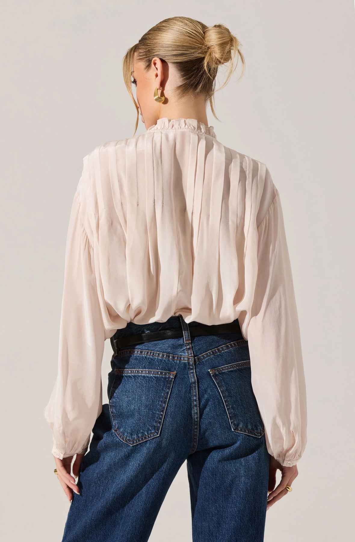 The ASTR the Label Ashton Top in Warm Champagne is a refined statement blouse designed to marry romantic detailing with everyday ease. This blouse exudes soft sophistication with its pleated ruffle trim skirted along the high neckline, lending gentle texture and feminine flair.