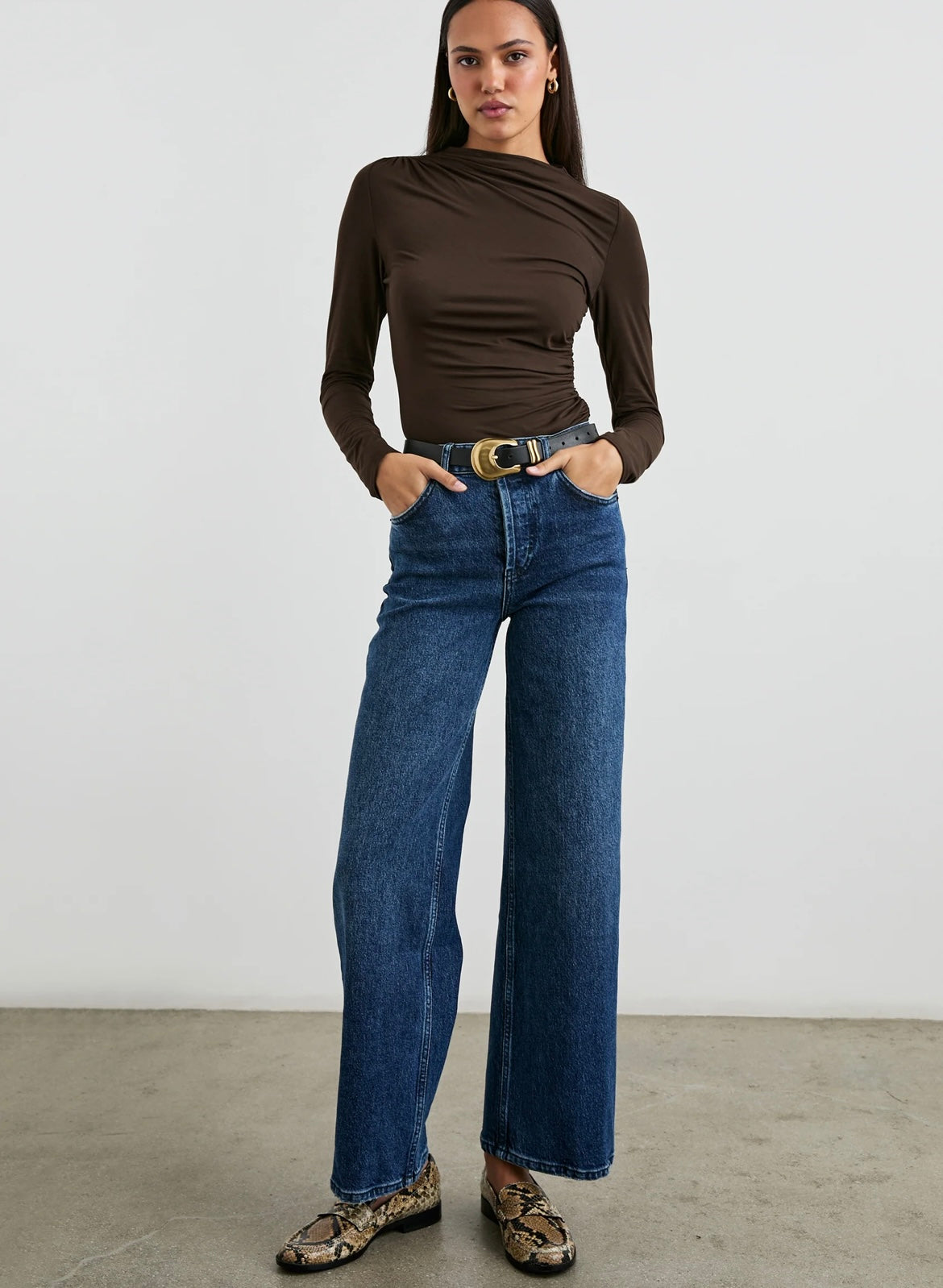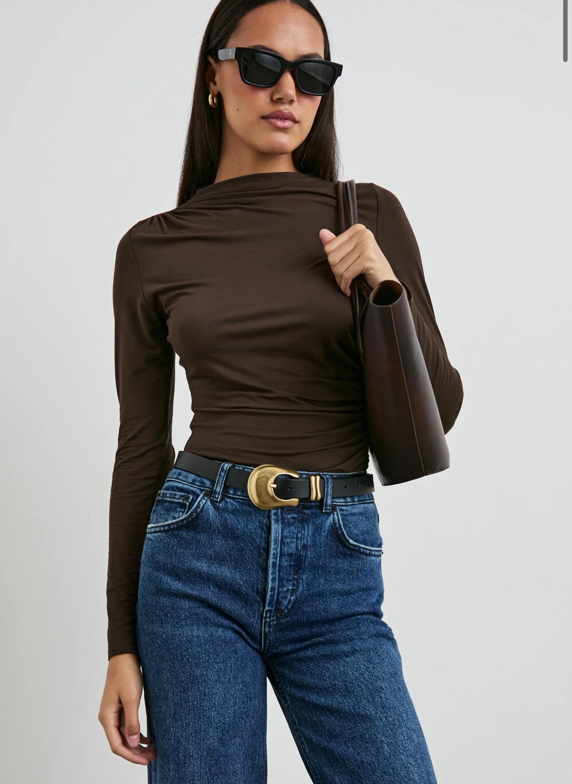 Made from soft gauge jersey, this style features an asymmetrical mock neck with shirring details from the right shoulder.