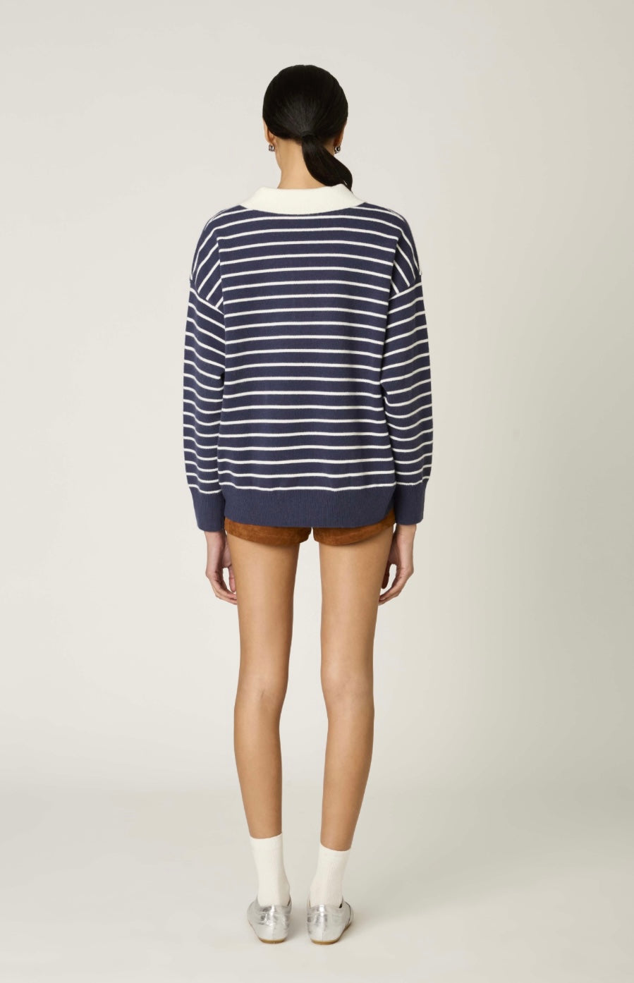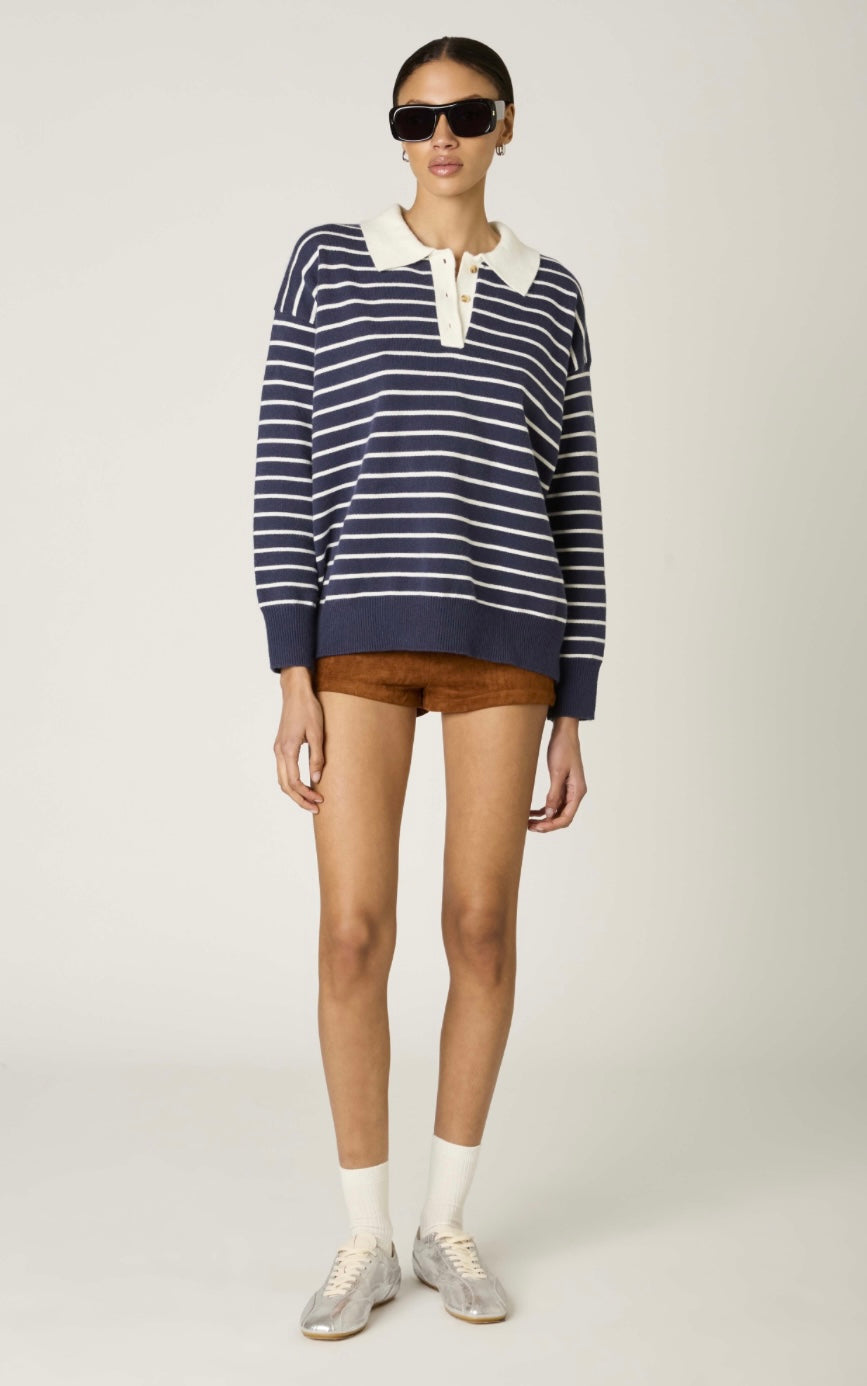 The NIA Alameda Sweater in Navy is a fresh take on a classic knit, effortlessly blending relaxed comfort with crisp, timeless style.