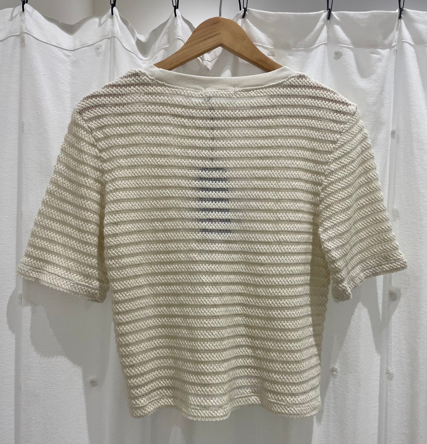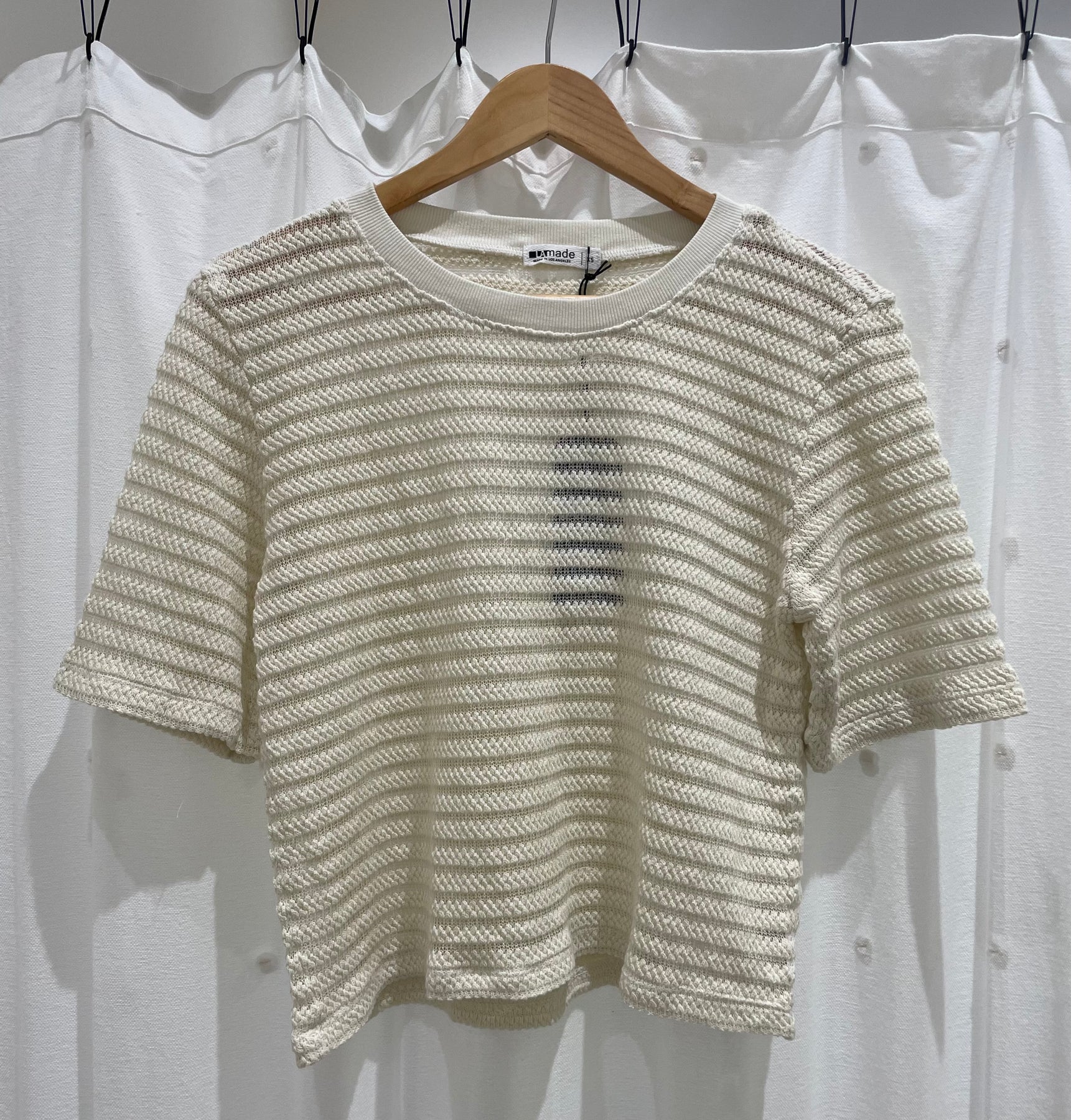 The LA Made Nights In The City Stripe Tee in Ecru is an elevated take on the everyday classic. Designed with a softly structured knit, this short sleeve top features horizontal ribbing that adds depth and dimension to its minimalist silhouette. The crew neckline and relaxed fit make it easy to wear, while the airy open-weave knit keeps it breathable and effortlessly chic.