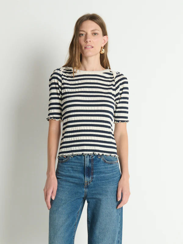 The Nation Los Angeles April Envelope Top in Crinkle Stripe is a relaxed yet refined staple with effortless everyday appeal. Crafted from a lightweight crinkle-stripe fabric, this top features an elegant envelope neckline that flatters the collarbone and brings a touch of refined ease to your wardrobe.