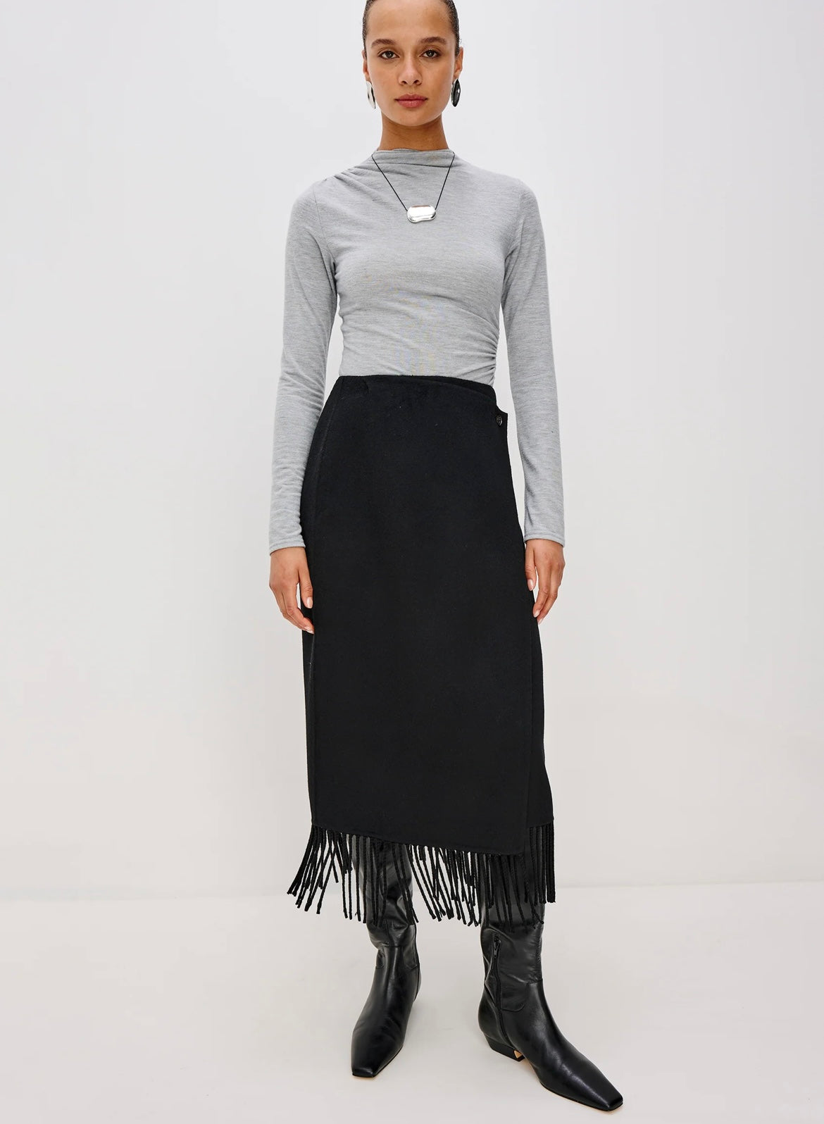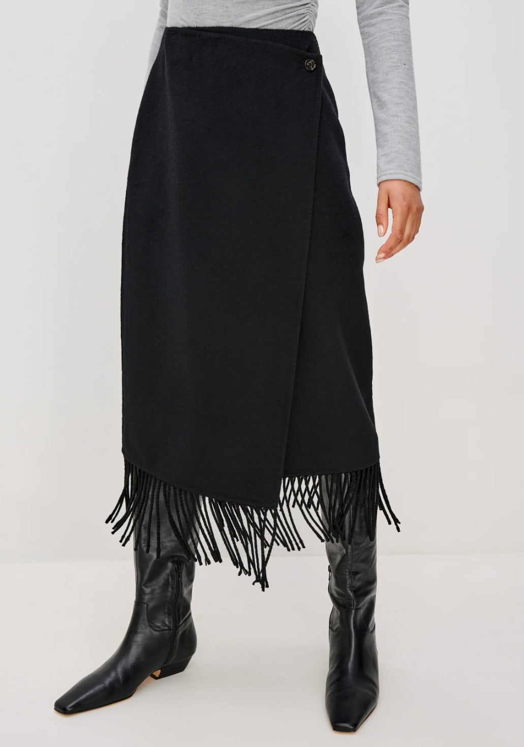 Made from a super soft heavyweight wool blend, this high-waisted midi skirt features a wrap-style design with a button at the side and an interior button for a secure fit.