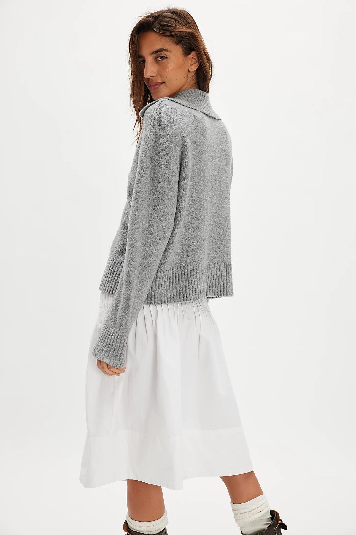 The Free People Trading Up Polo in Grey Heather is the perfect cozy piece for fall layering — relaxed, stylish, and soft. Designed with a classic polo-inspired silhouette, this sweater features a collared neckline, long sleeves, and tortoise-shell buttons that add a subtle touch of character.
