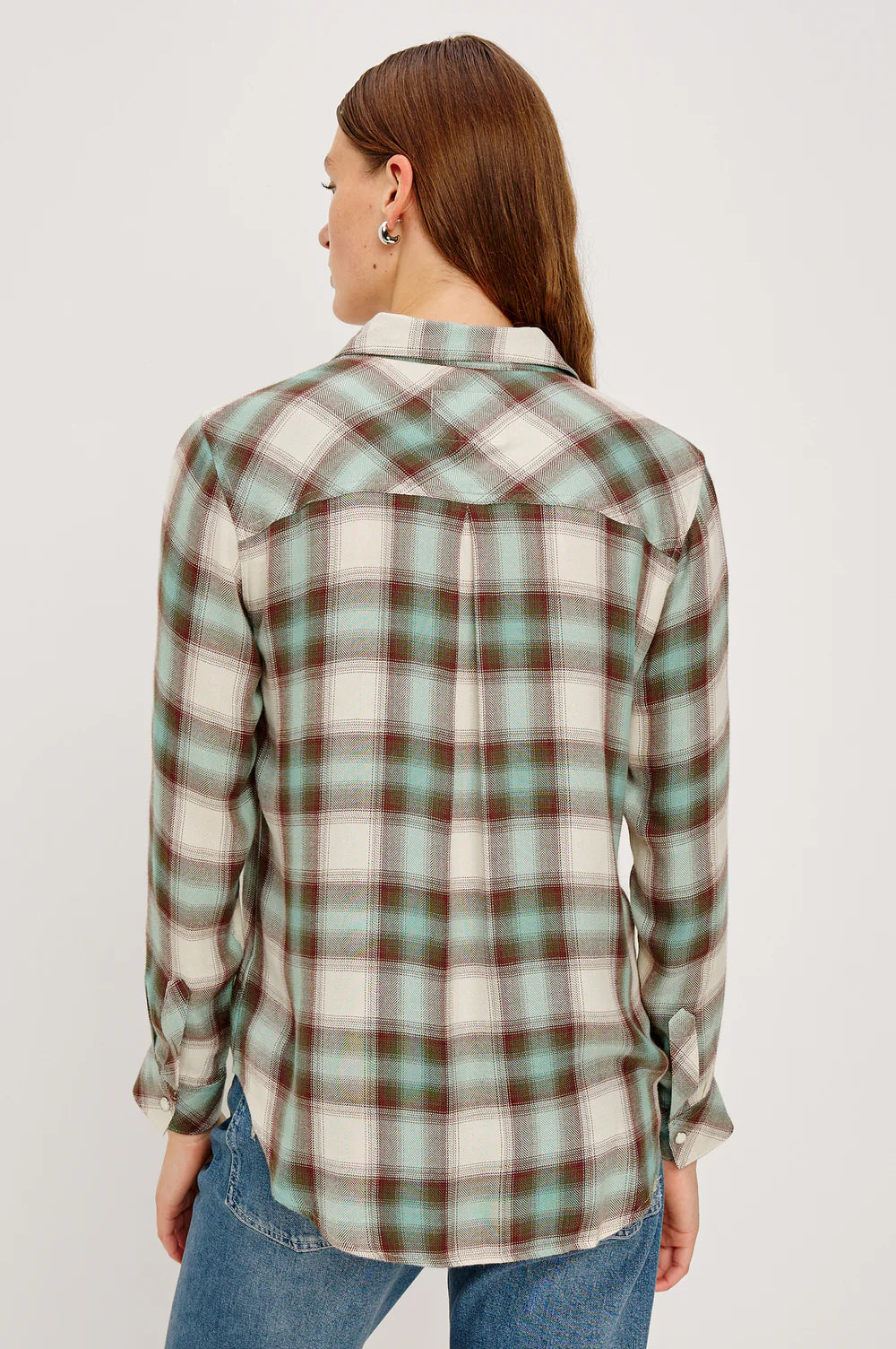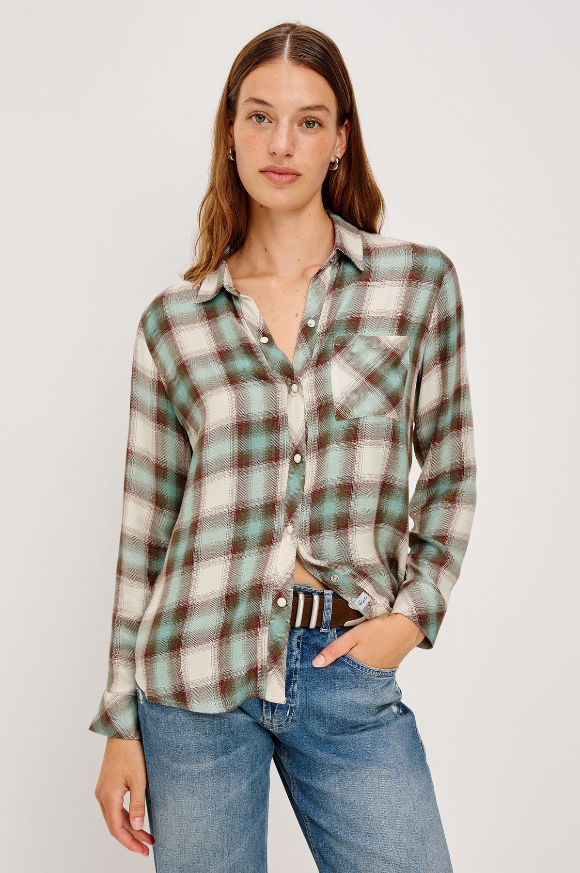 The Rails Hunter Shirt in Birch Olive Teal is a luxuriously soft, casual blouse adorned with a classic plaid. Lightweight, comfortable, and relaxed, this shirt is perfect for wearing solo or layered.