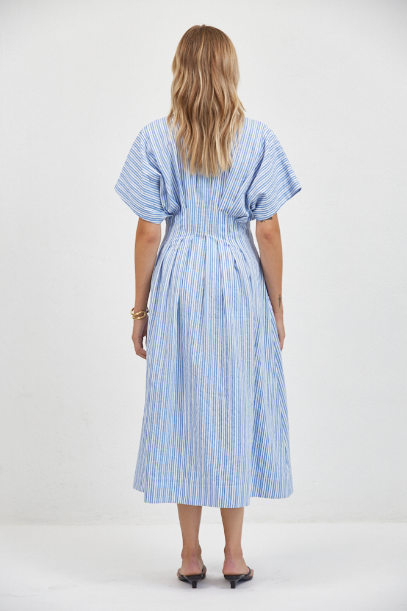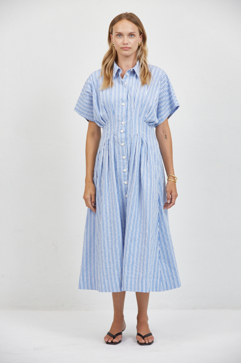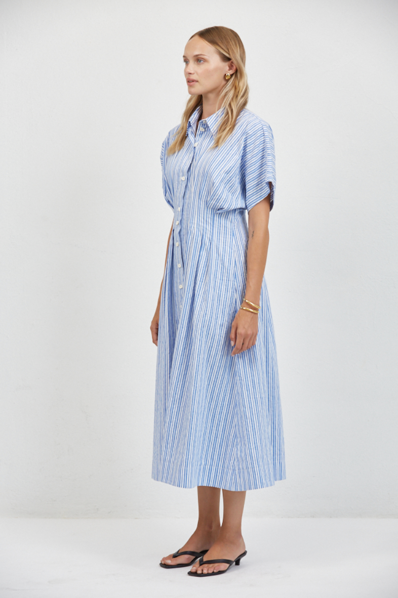 The a.ren Aster Striped Shirtdress is an effortlessly polished piece that blends classic tailoring with an easy, feminine silhouette. Designed with a crisp collared neckline and full button-front closure, this midi dress features subtle pleating at the waist that creates shape while maintaining a relaxed, comfortable fit.