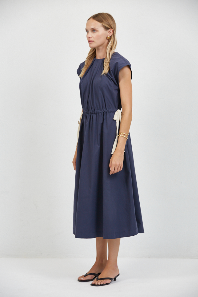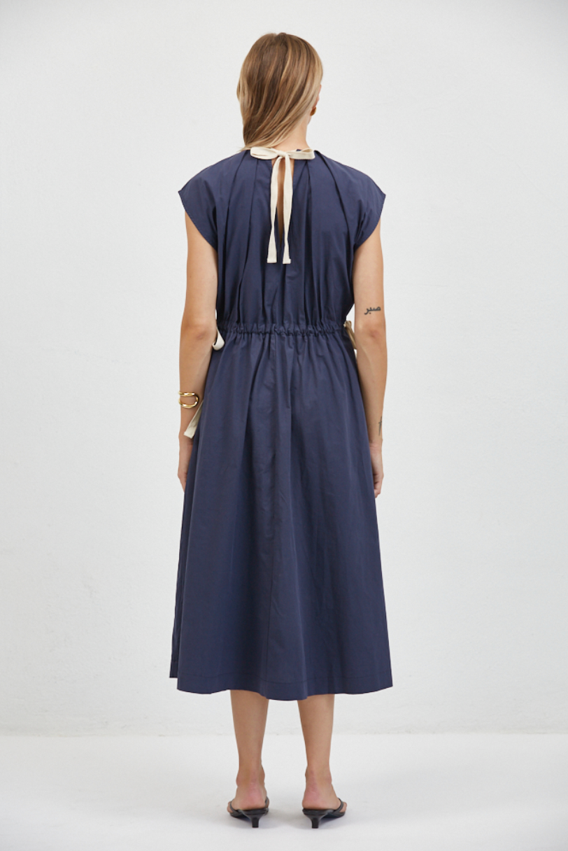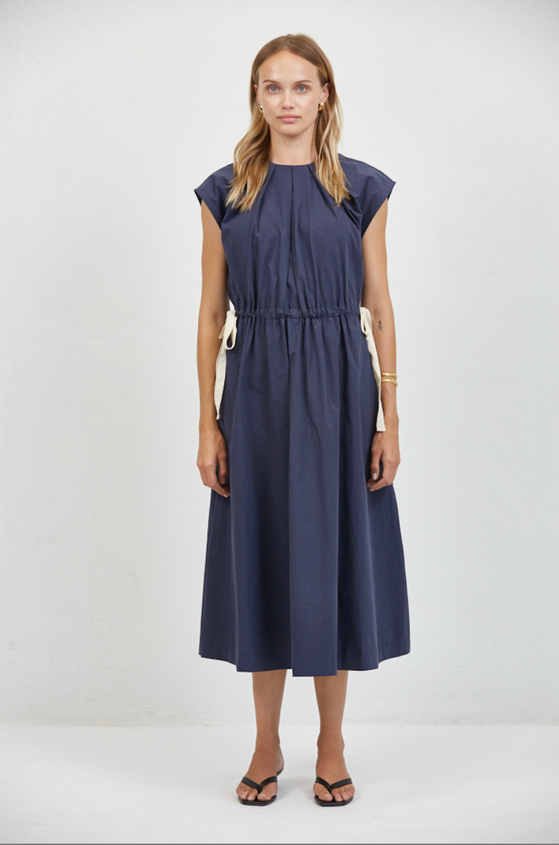 The a.ren Nais Gathered Dress is a modern, minimalist silhouette designed with effortless structure and subtle detail. Featuring a refined high neckline and sleeveless design, this midi dress is crafted from breathable cotton and finished with soft gathering that creates shape while maintaining a relaxed feel.