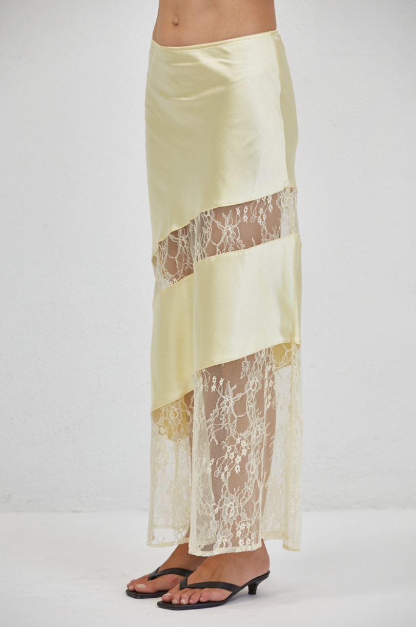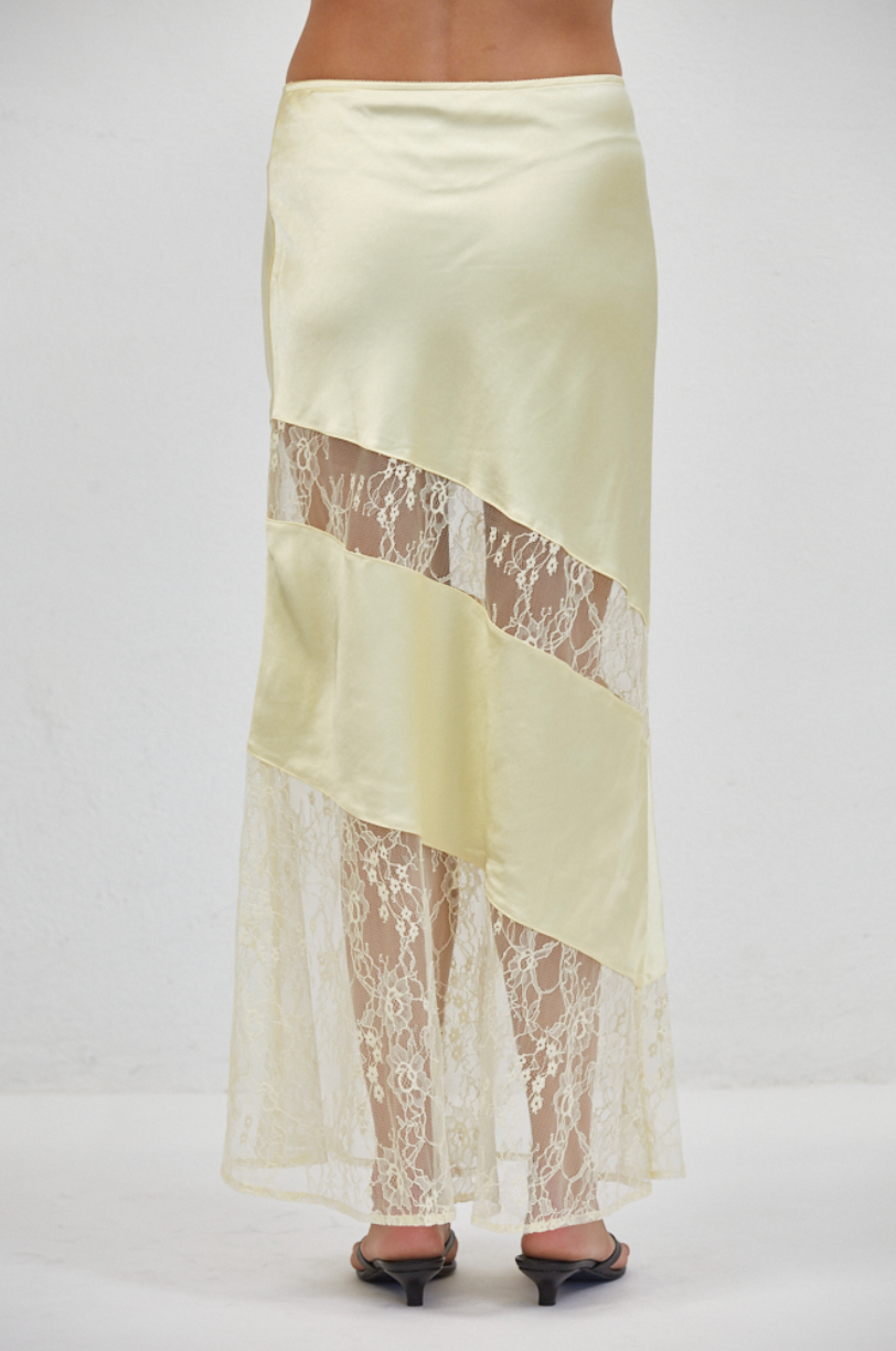 The a.ren Sabrin Skirt is a sleek, statement-making piece that blends silky satin with delicate lace for an elevated, feminine look. Designed with a flattering midi silhouette, this skirt features a smooth satin finish and an asymmetrical lace overlay that adds texture and visual interest.