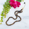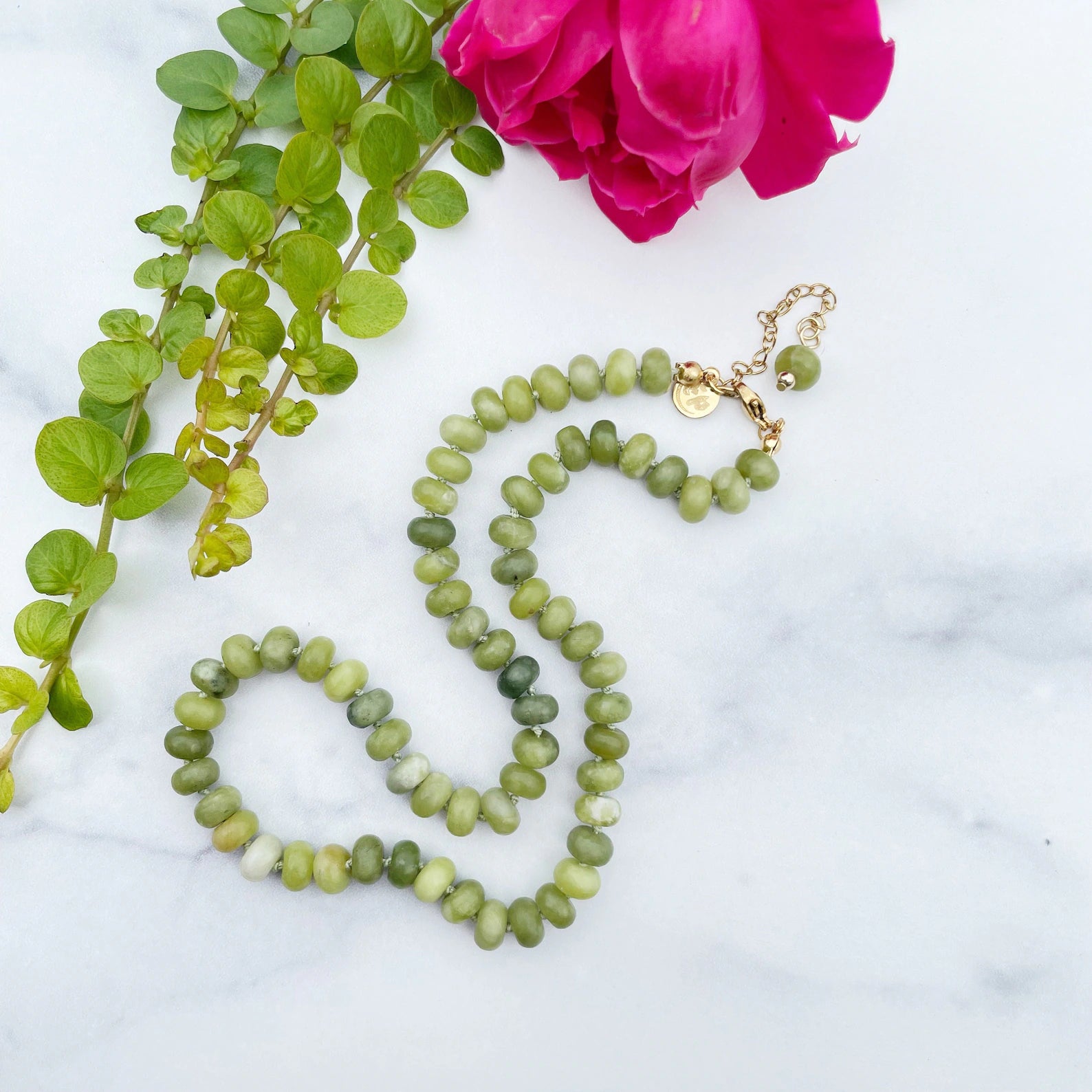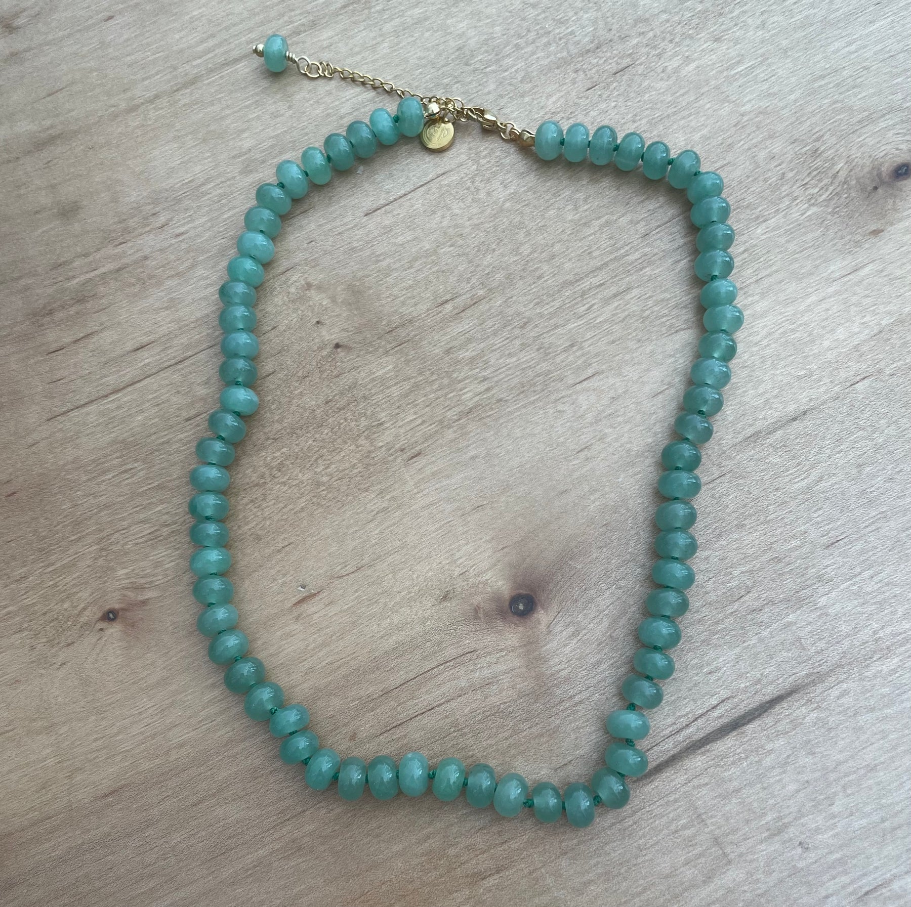 The Ewelina Pas Jewelry Hand Knotted Beaded Necklace is a delicately hand-knotted piece made from natural gemstone beads, each measuring approximately 8mm. Strung on durable green nylon cording and knotted between each bead for added strength and elegance, this 17-inch features a 2-inch gold-plated stainless steel extension chain, clasp, and signature logo charm for a secure, adjustable fit.