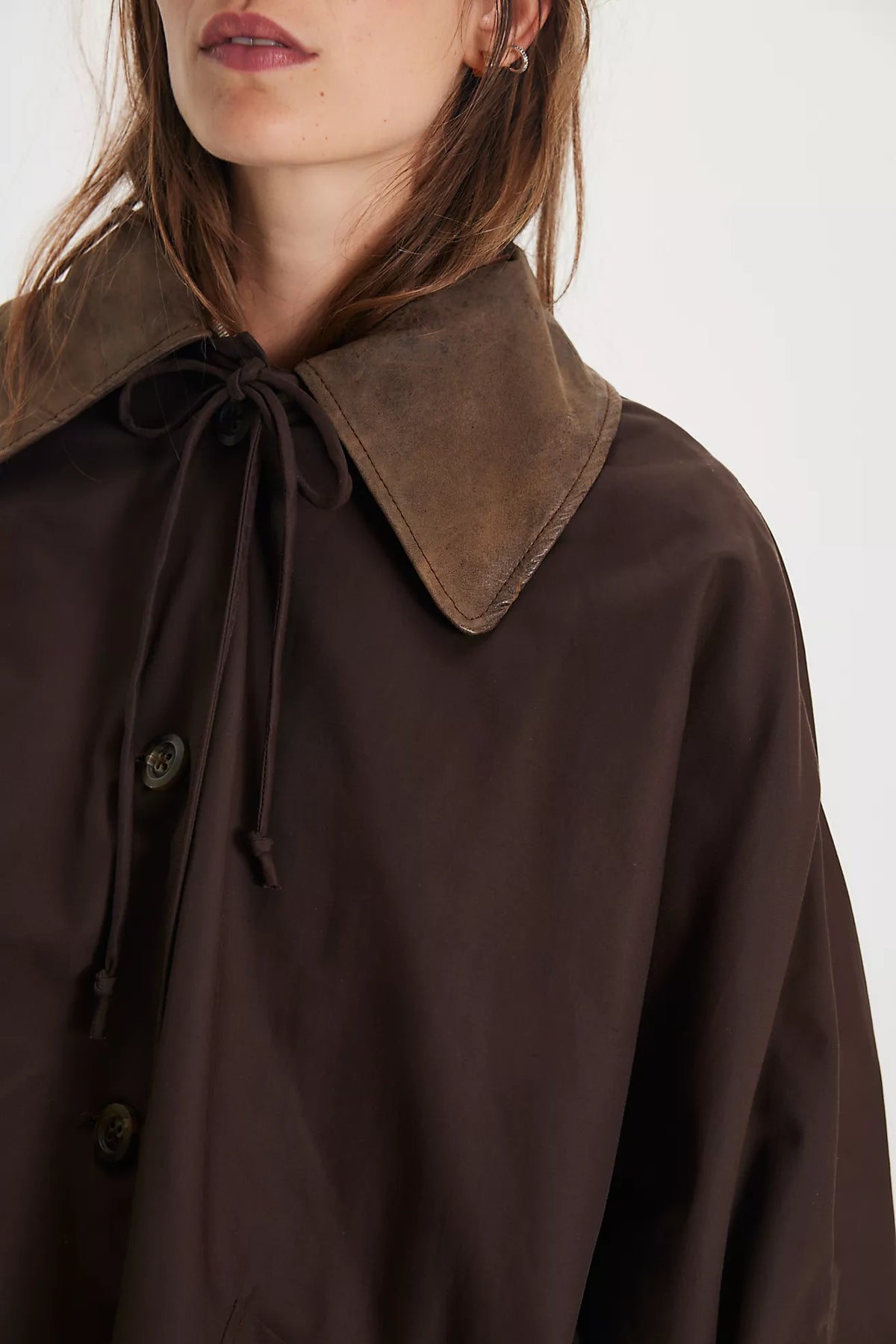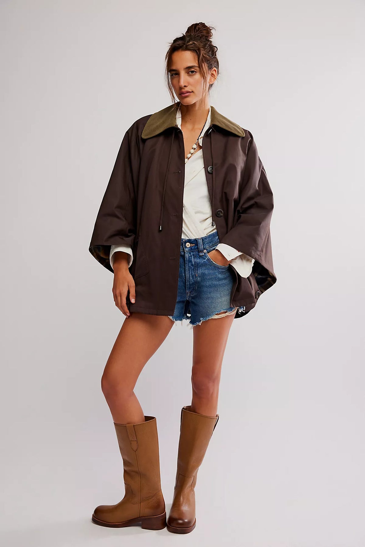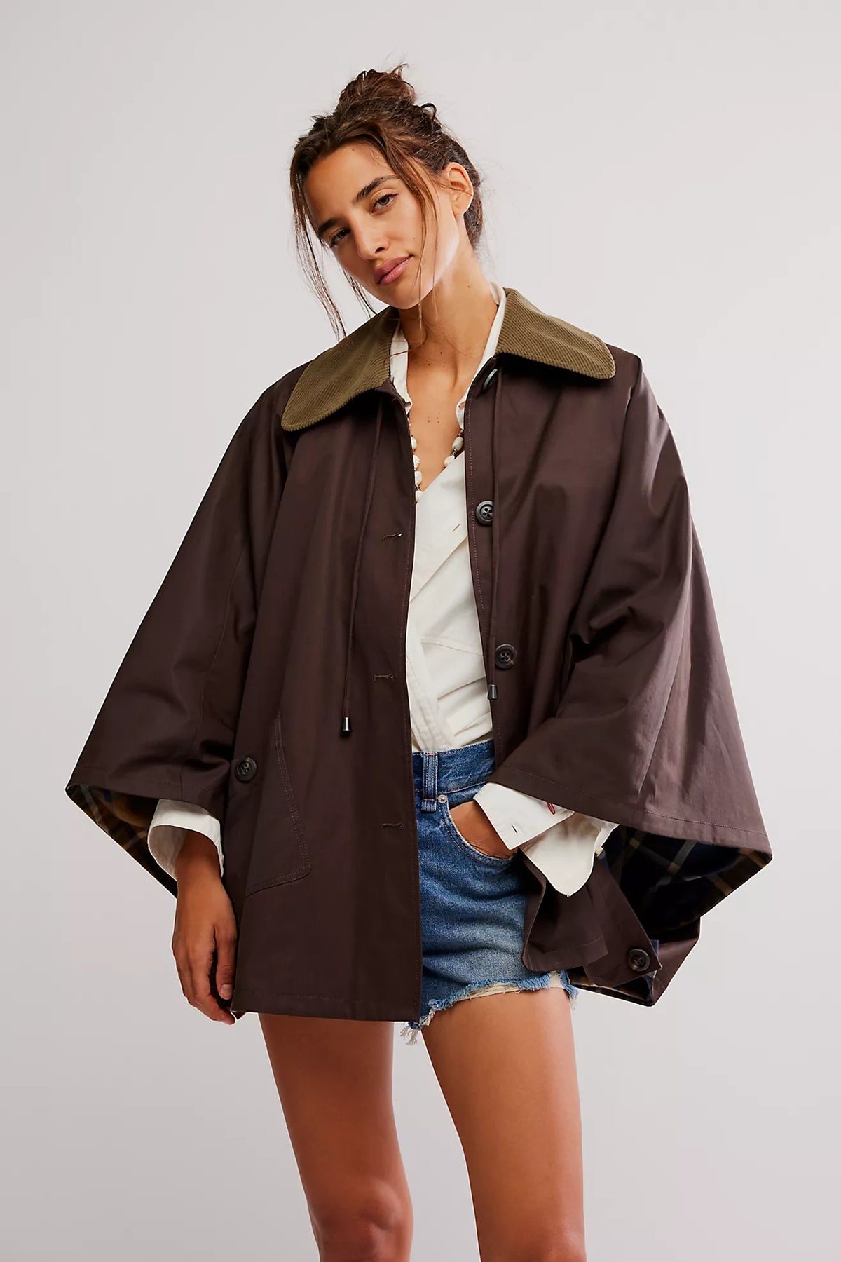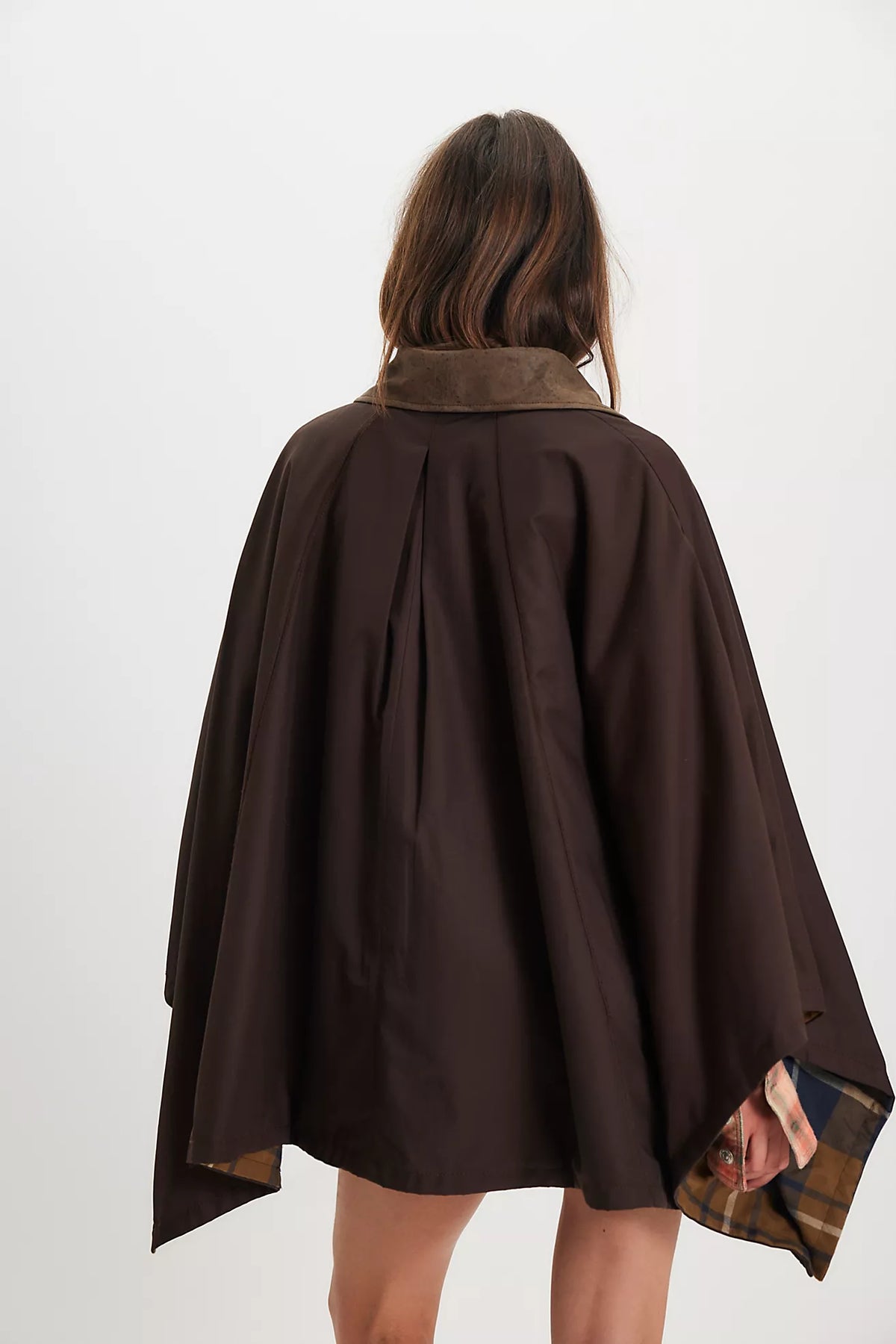 The Free People Bailey Cape in Italian Mocha is a dramatic, oversized cape-style jacket designed to make a statement. Crafted from a cozy cotton-nylon blend, it features an elegantly oversized collar and a playful plaid lining that adds visual interest when draped or worn open.