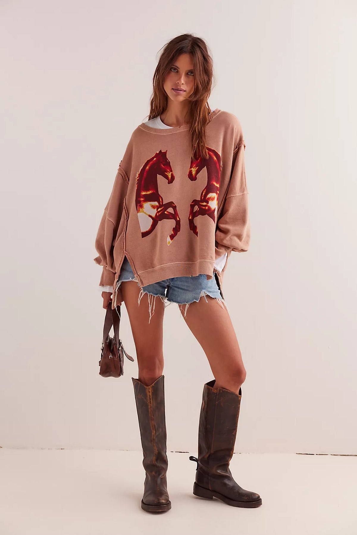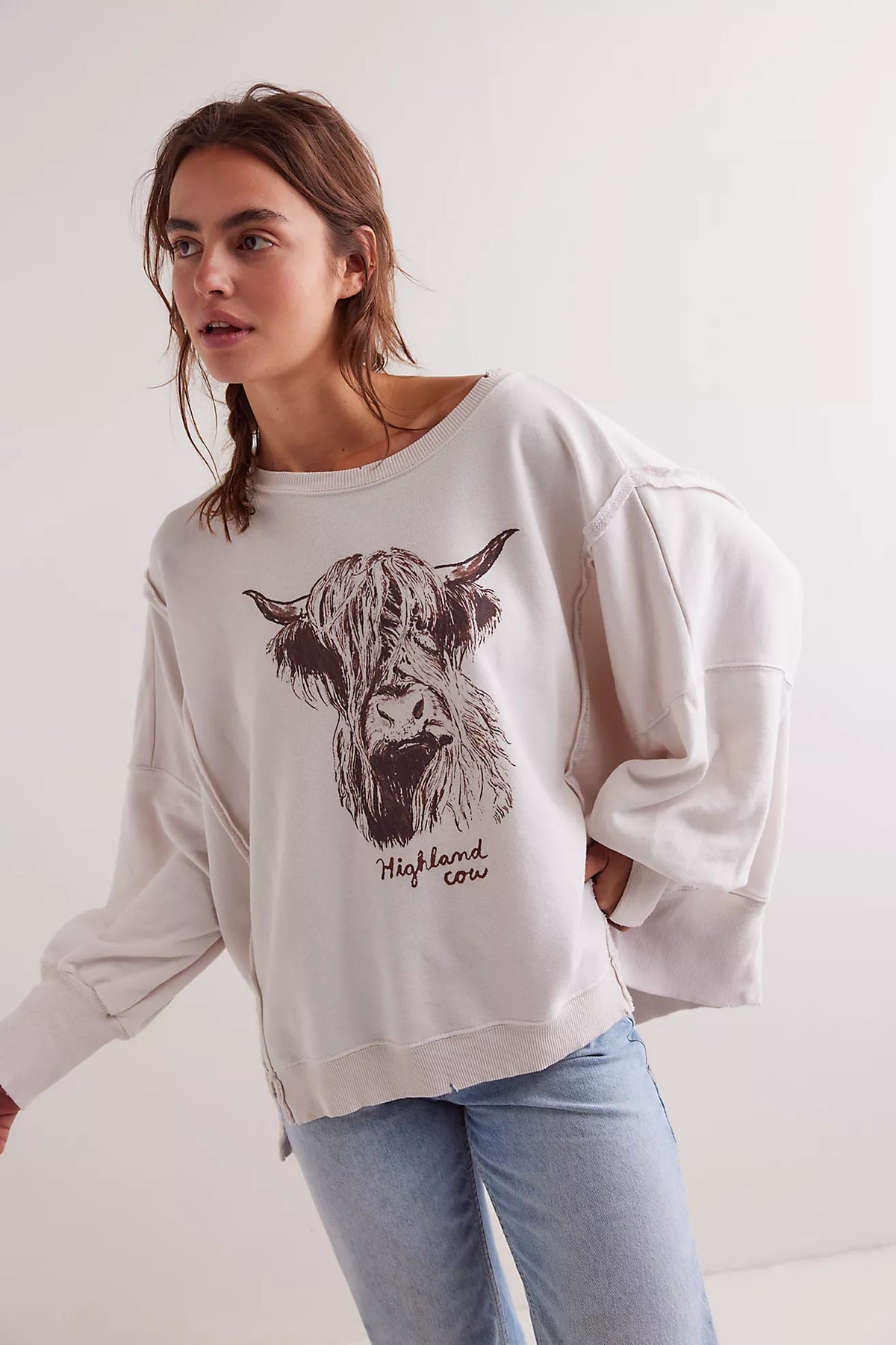 The Free People We The Free Graphic Camden Pullover in Mirrored Horses and Highland Cow Combo is a bold, oversized sweatshirt that blends cozy comfort with a statement-making graphic. Featuring a slouchy silhouette, raw hem detailing, and a lived-in vintage wash, it’s the perfect throw-on piece for adding a bit of Western charm to your casual wardrobe. Pair it with denim or leggings for an effortlessly cool look!