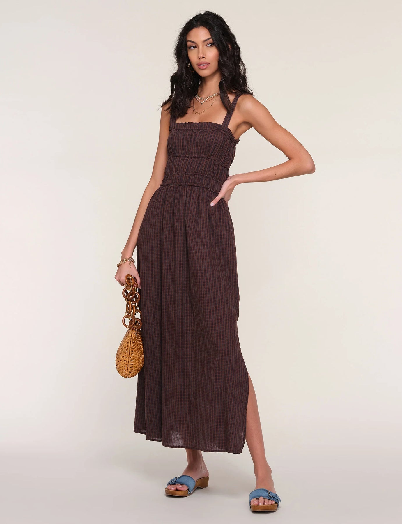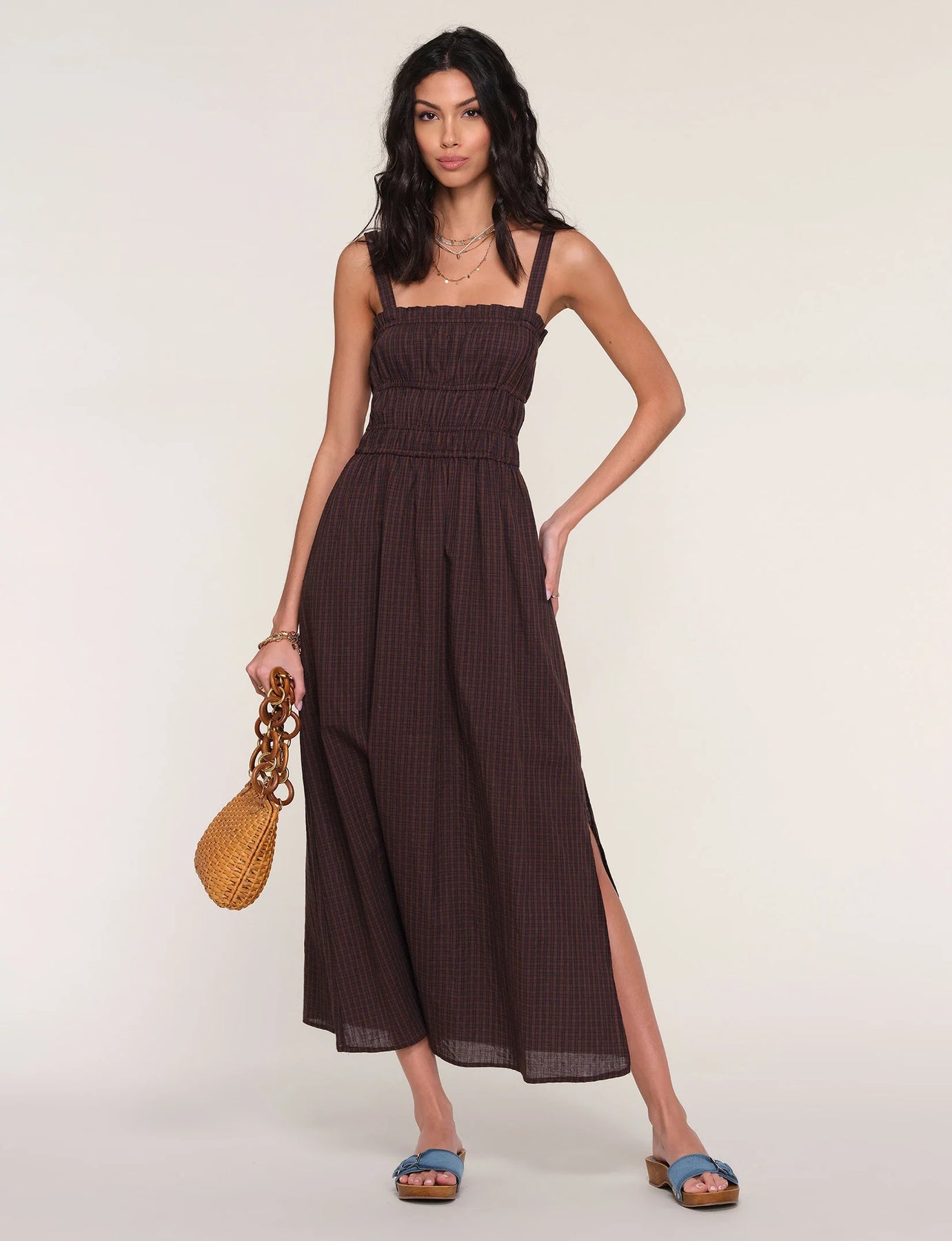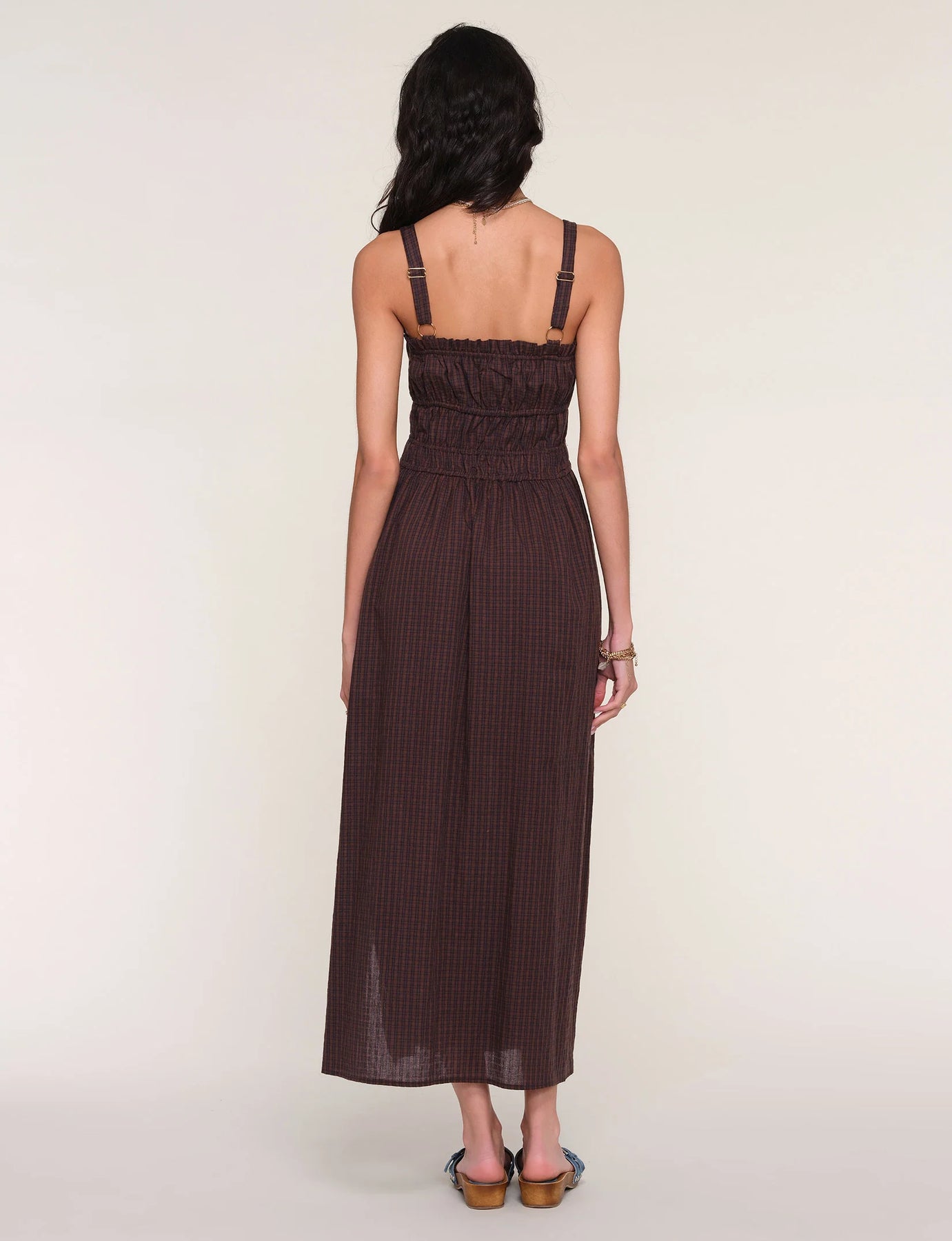 The Heartloom Auburn Dress in Coco is an effortlessly romantic midi crafted from soft, washed cotton voile in a warm black-and-brown gingham. Featuring a flattering square neckline, adjustable straps, and a gently cinched waist, it drapes into a breezy mid-calf skirt with a subtle side slit. Lightweight and versatile, it’s perfect for sunny days or layered looks—easy, elegant, and endlessly wearable.