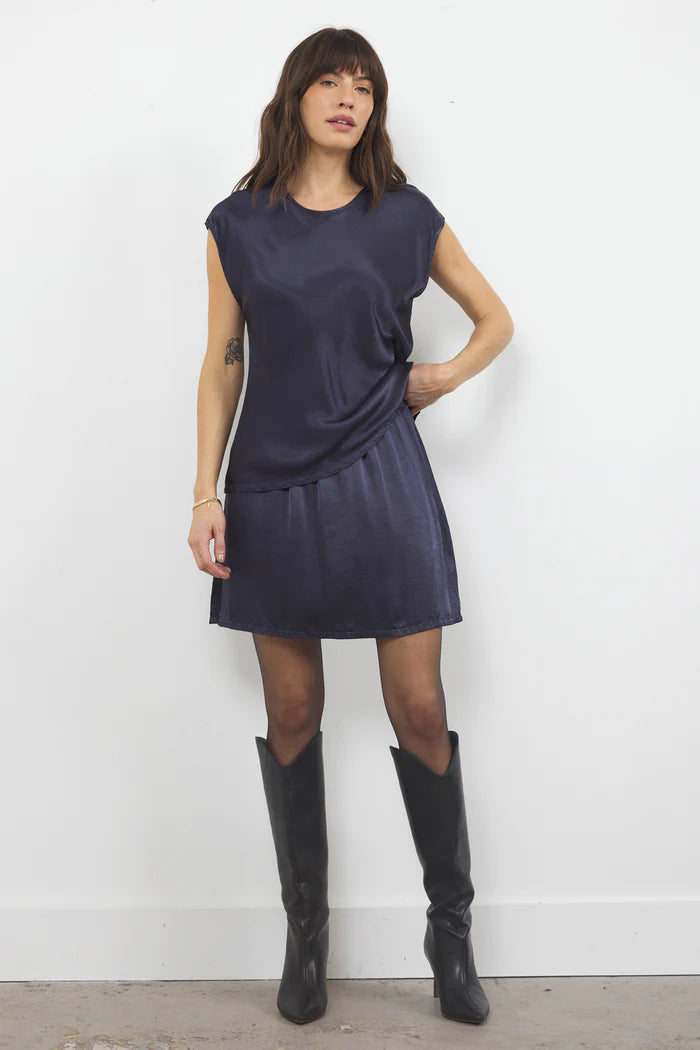 The LA Made Oscar Satin Top in Pewter is a sleek, elevated essential with a modern edge. Designed in a rich navy-toned pewter hue, this satin-finish top features a classic crew neckline and subtle cap sleeves for a clean, tailored look. Its lightweight drape and minimalist silhouette make it perfect for both office polish and weekend ease—just tuck it into trousers, denim, or a midi skirt for an instant outfit upgrade.