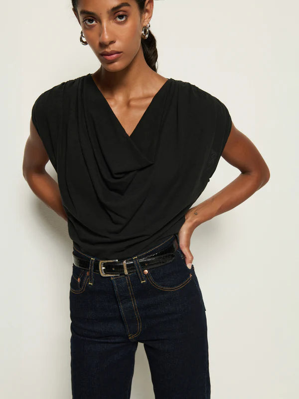 Effortless and elevated. The Nation LTD Geni Top in Jet Black features a soft cowl neckline and cap sleeves for a draped, sophisticated silhouette. Made from pima cotton, this relaxed fit tee blurs the line between laid-back and polished—perfect for dressing up denim or tucking into a sleek skirt. A timeless wardrobe staple with just the right amount of edge!
