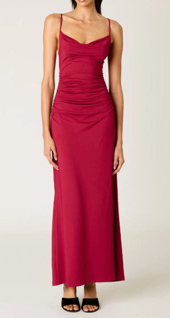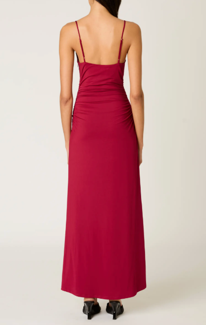 The NIA Ina Dress in Cranberry is a full-length knit gown that balances ease and style. Featuring a subtle drape at the cowl neckline, shirring throughout the bodice for texture and fit, and a dramatic thigh-high slit, this dress is designed to move with you and make an impact.